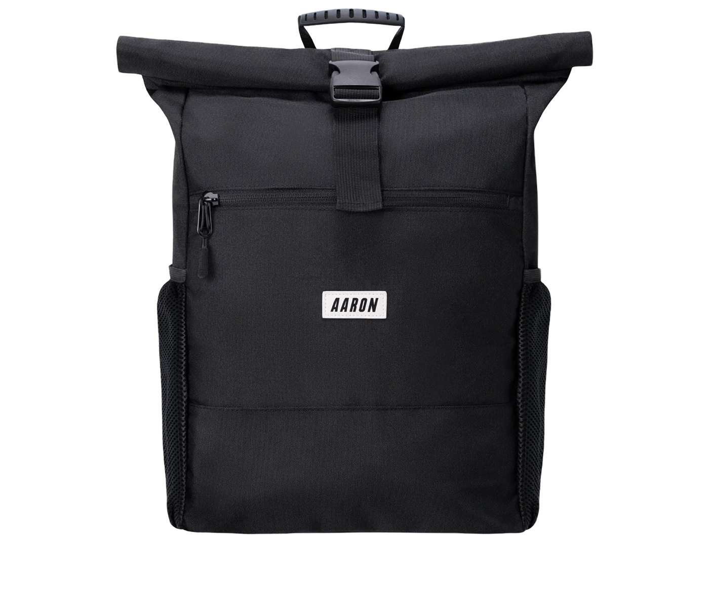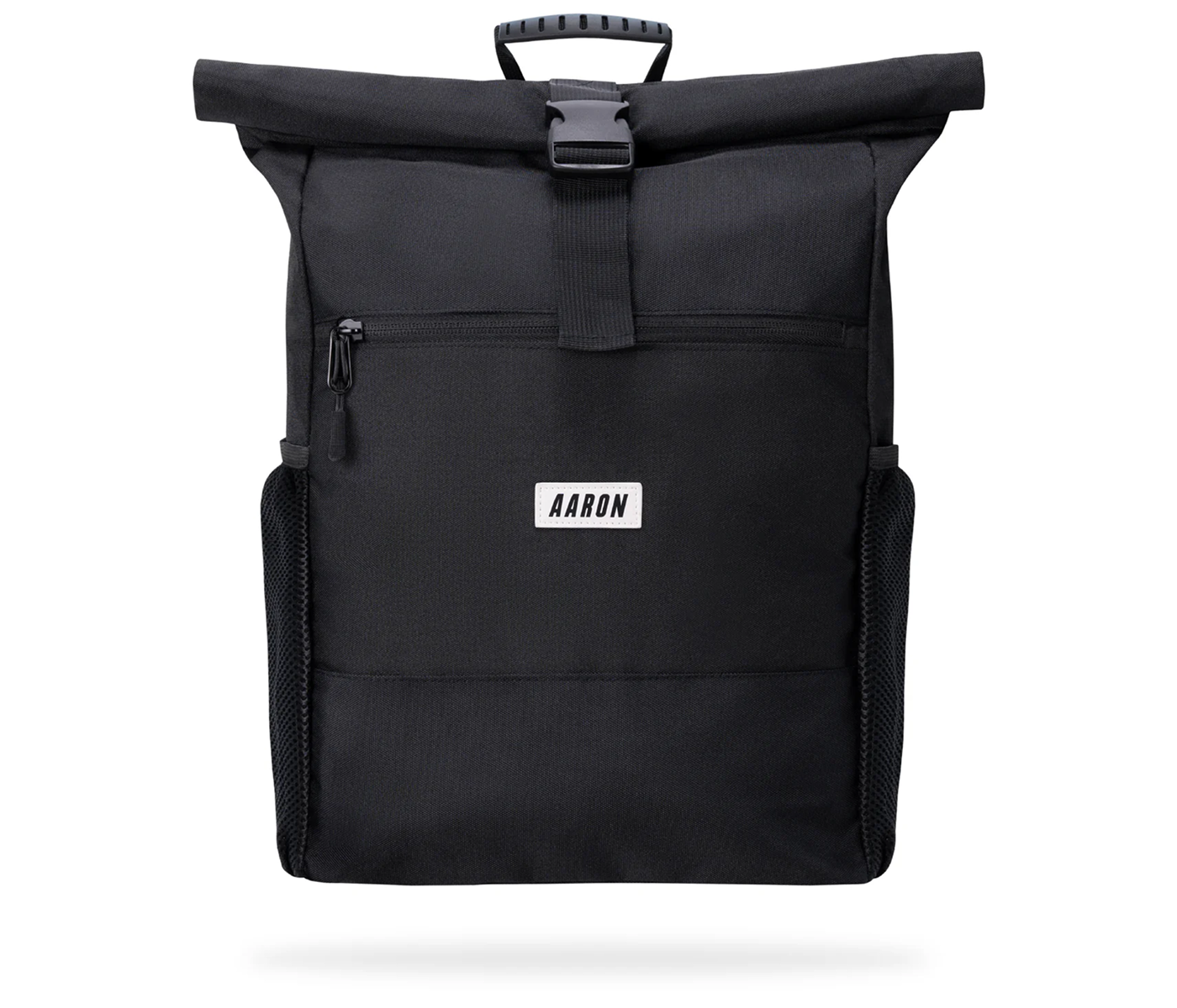 Der AARON Rolltop 2.0 misst 45 × 30 × 13 cm und bietet durch die Rolltop-Funktion ein variables Volumen von 18 bis 26 Litern. Das Material besteht aus 100% recyceltem 900D PET Polyester mit wasserabweisender Beschichtung. Ausstattung: gepolstertes Laptopfach bis 15", verstecktes Rückenfach, AirTag-Halter, ergonomischer Brustgurt, praktische Außenfächer. Der Rucksack ist Prüfengel-zertifiziert (Testzeitraum 11/23), kommt mit 3 Jahren Garantie, kostenlosen Ersatzteilen, 30 Tagen Rückgaberecht und kostenlosem Rückversand.